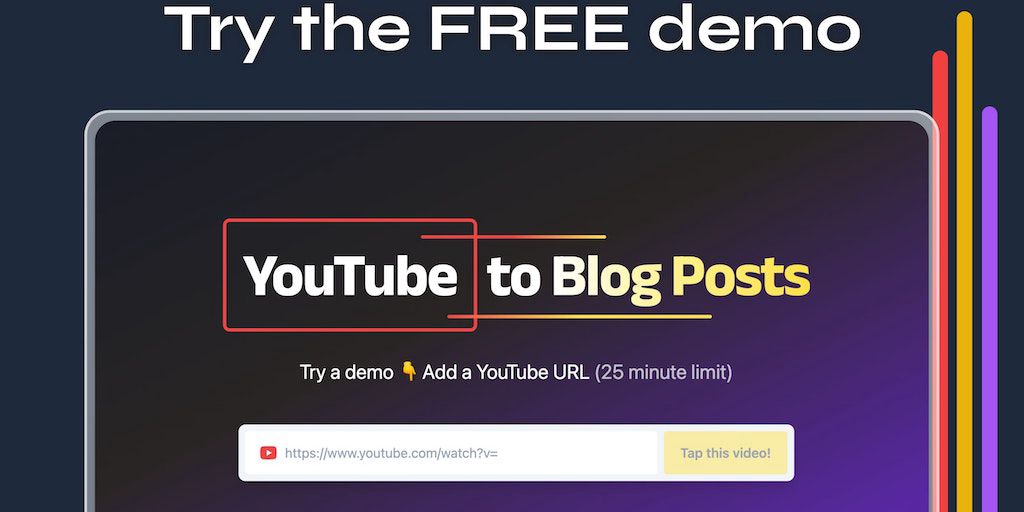 Video Tap unleashes the full potential of your videos by repurposing them with AI. Add a YouTube URL and get a ready-to-publish blog post. Try it for FREE. It's perfect for content teams looking to ma