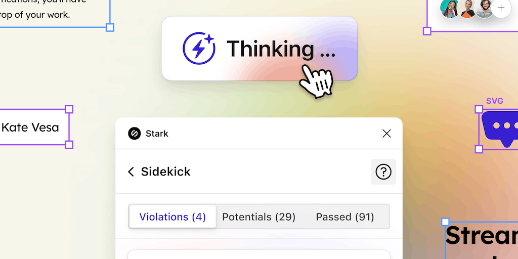 With Sidekick, accessible design just got ten times faster. Sidekick uses AI to automatically scan your entire design file for accessibility, give you a list of any issues, and suggest fixes.