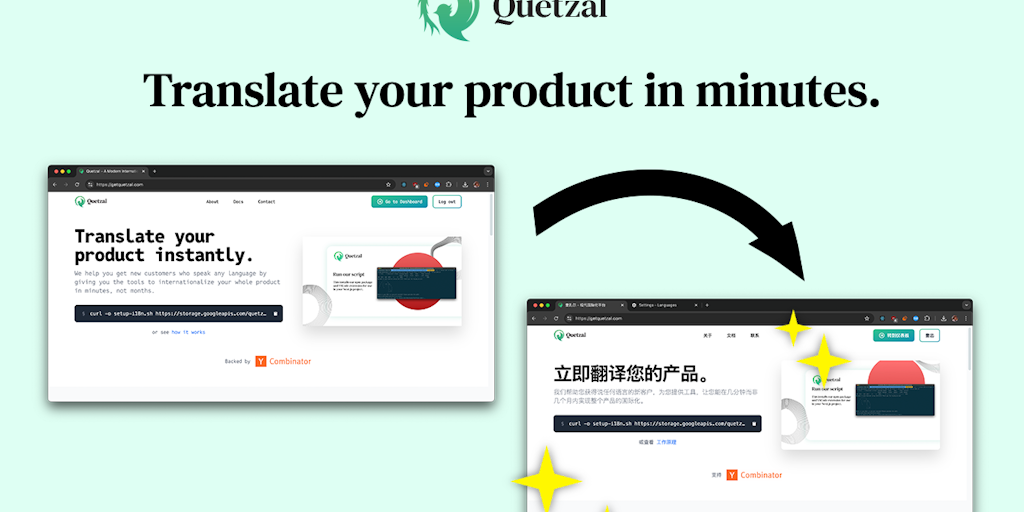 Quetzal is the easiest and fastest way to translate your product, like Stripe for internationalization. Just plug in and translate your whole app to whatever languages you want.