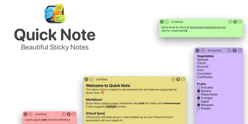 Quick Note is a native sticky-note app for Mac that lets you create notes from a menu bar launcher or using a shortcut. Some of the features include iCloud sync, Pinned notes, Folder organization and