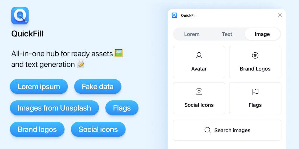 QuickFill is a Figma plugin that streamlines your workflow with ready-to-use text and visual assets. Generate realistic text in 45+ languages, access logos, avatars, flags, and social icons, and integ