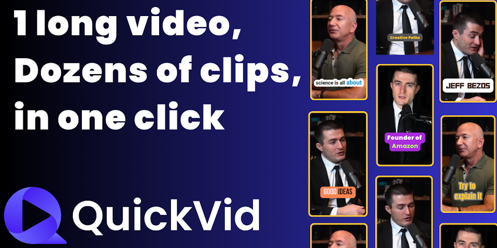 QuickVid Autopilot is a generative video AI tool that curates, edits, and posts clips from your existing videos. Simply connect your Video Source (Youtube, Drive, Zoom) and your Posting Destination(Yo