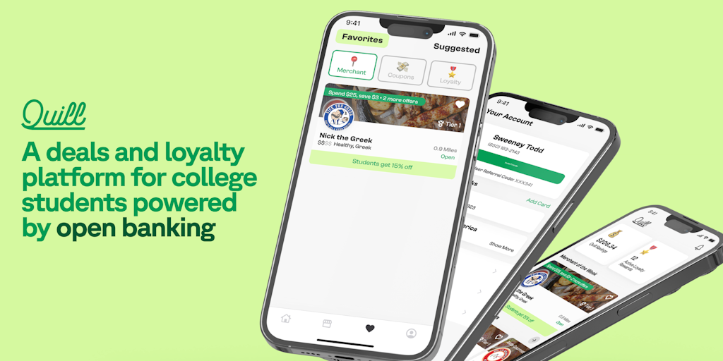 Quill is a deals and loyalty platform for college students powered by open banking. It's a tool where merchants can target and incentivize students who are already shopping at their competitors, and s