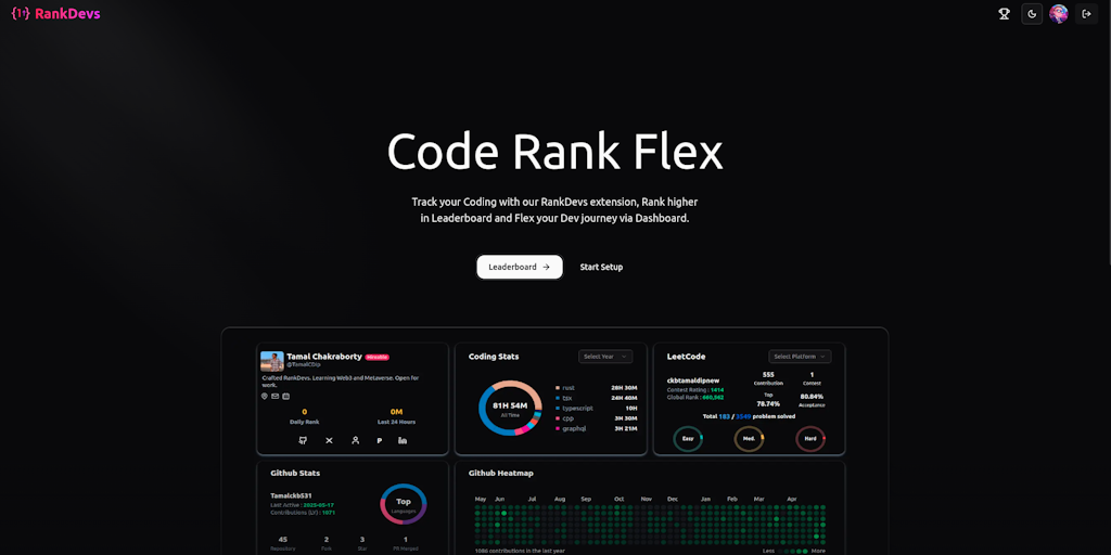 Track your coding time, rank globally, and build a dev portfolio all with RankDevs. Real-time VS Code tracking GitHub/LeetCode/Codeforces integration and a public dashboard that shows your grind. Open
