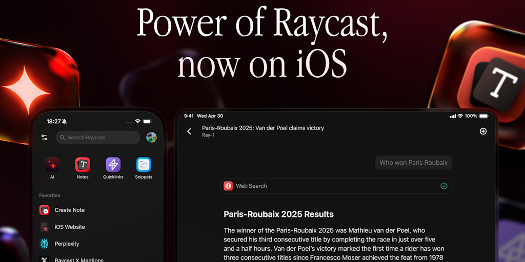Introducing Raycast for iOS: Your all-in-one productivity toolkit with AI, Notes, and more – now on mobile as the perfect companion to the macOS app. It seamlessly extends your desktop workflow to mob