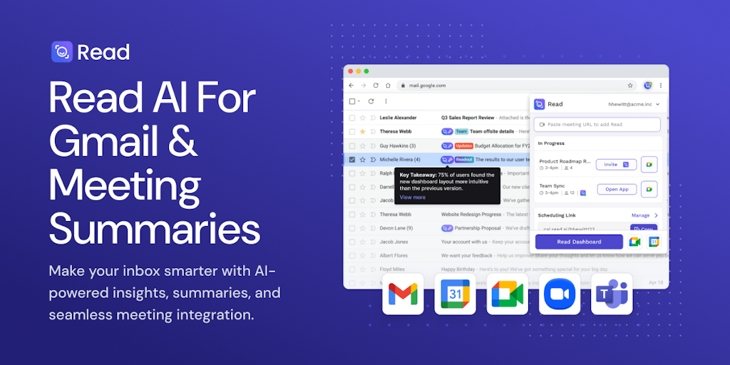 Read AI for Gmail integrates directly into Gmail to bring AI into your inbox by automatically summarizing threads and surfacing relevant information from meetings, emails, and messages.