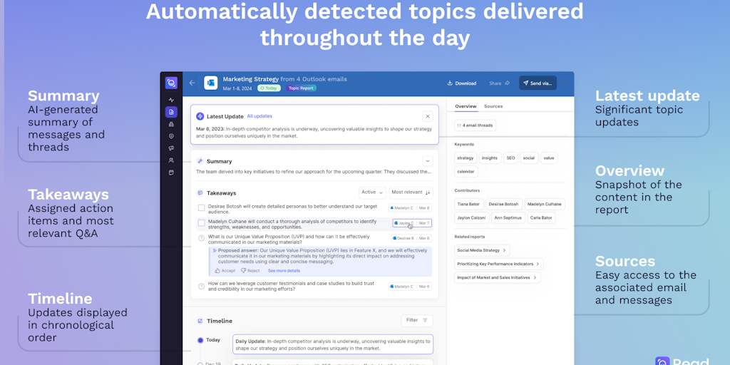 Read introduces gen AI summaries, “Readouts”, for email and messaging on Gmail, Outlook, Teams, and Slack. Read’s intelligent agents work quietly in the background, enabling your meetings, emails, and