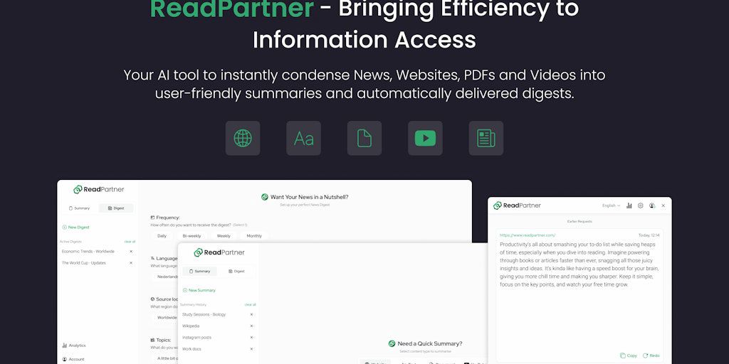 An AI Summary and News Digest tool which values ease-of-use for everyone. ReadPartner allows you to create custom automated AI News Digests and summarize Websites, Documents, Videos, and Texts in just