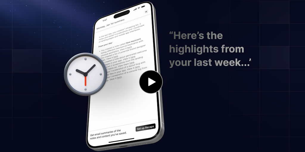 ⏪ Recap – an AI generated email roundup of your recent notes and bookmarks. Get your "read it later" content regularly sent to your email when you'll actually read it. With a convenient AI summary for
