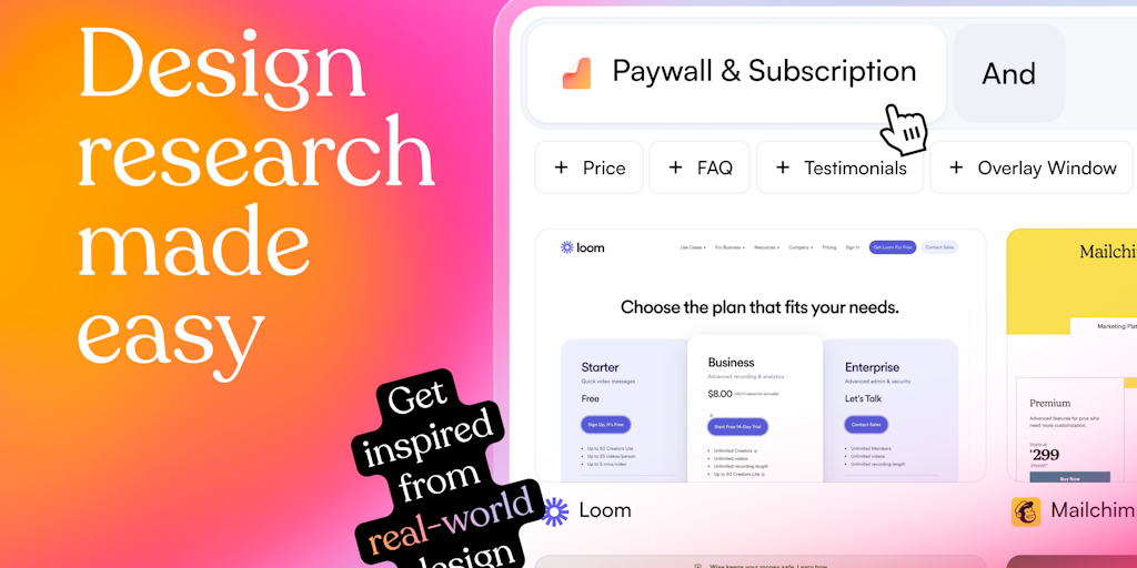 Your ultimate design research tool, get instant access to over 65,000 design references across web and iOS. Inspire from real-world designs from the best products.