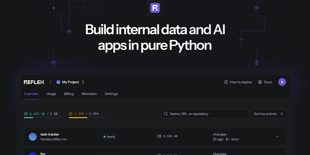 Build web apps in pure Python (no Javascript required) and deploy with a single command. Reflex Cloud includes a dashboard to manage our apps, custom domains, flexible memory and CPU options, One-Clic