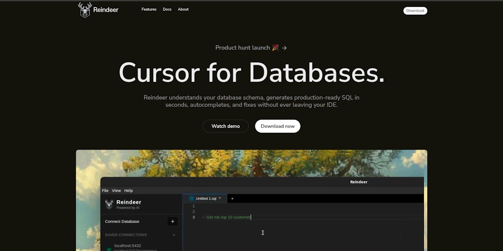 Reindeer is a Cursor-like IDE for databases. It understands your database schema, generates production-ready SQL in seconds, autocompletes, and fixes without ever leaving your IDE.