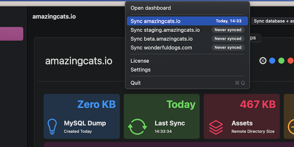 Sync databases and files from your server to your Mac with just two clicks from the menu bar