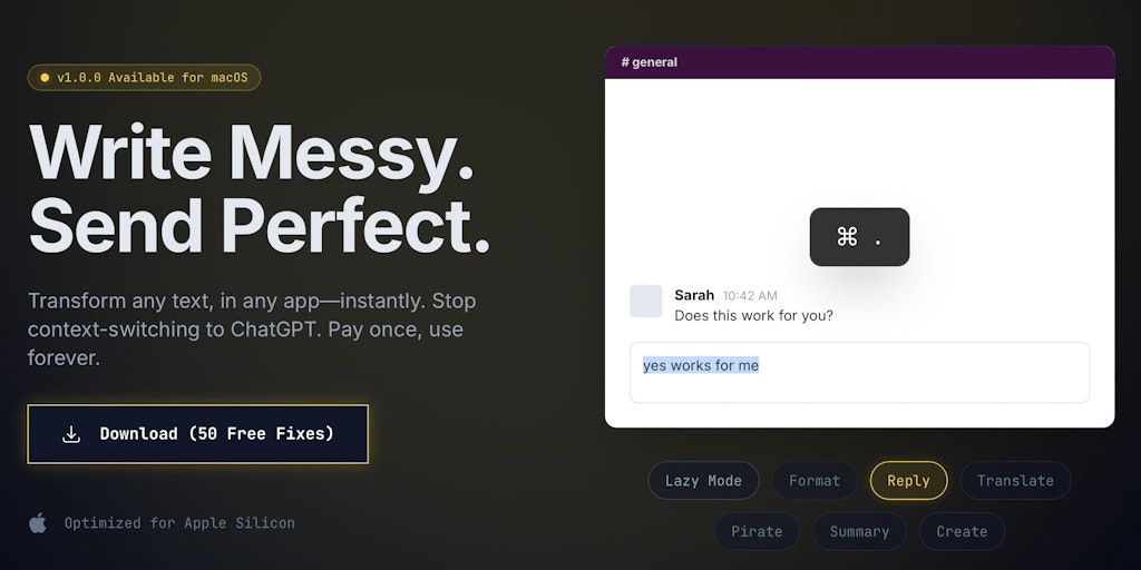 Stop context-switching to ChatGPT. Rephrase is a native macOS utility that fixes grammar, translates languages, and polishes your tone in any application (Slack, Xcode, Mail, Notes). Just select text