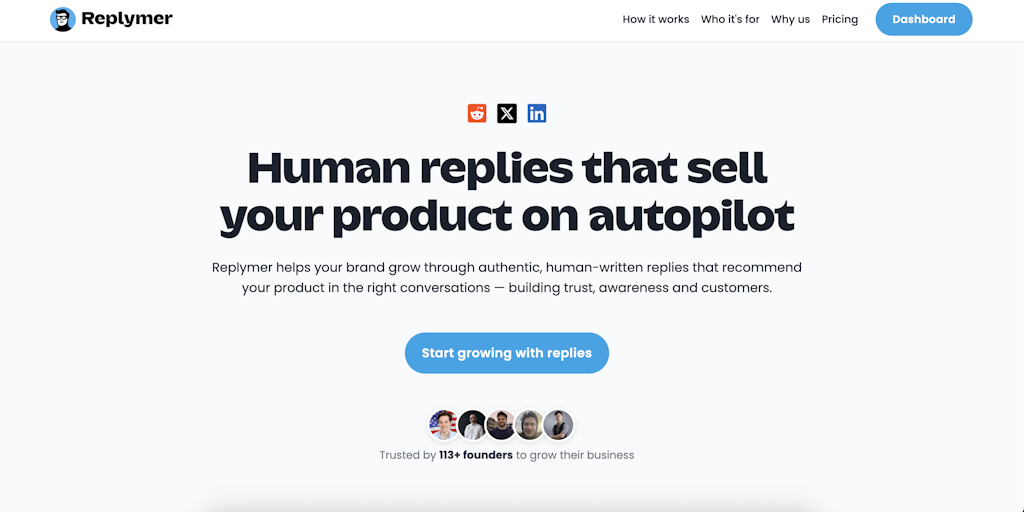 Replymer helps your brand grow through authentic, human‑written replies that recommend your product in the right conversations.