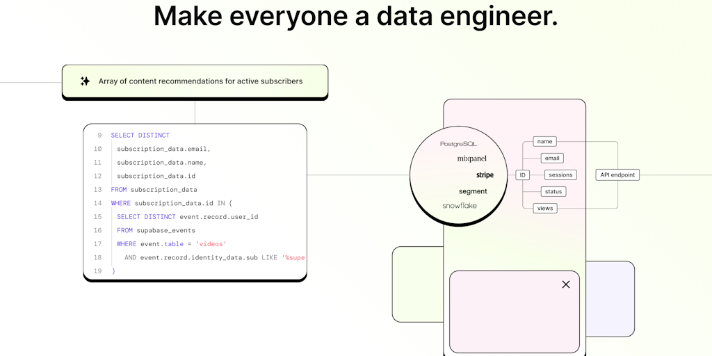 Query all your data in one place and ship real-time product features. Use our AI editor to make your data accessible and interoperable.