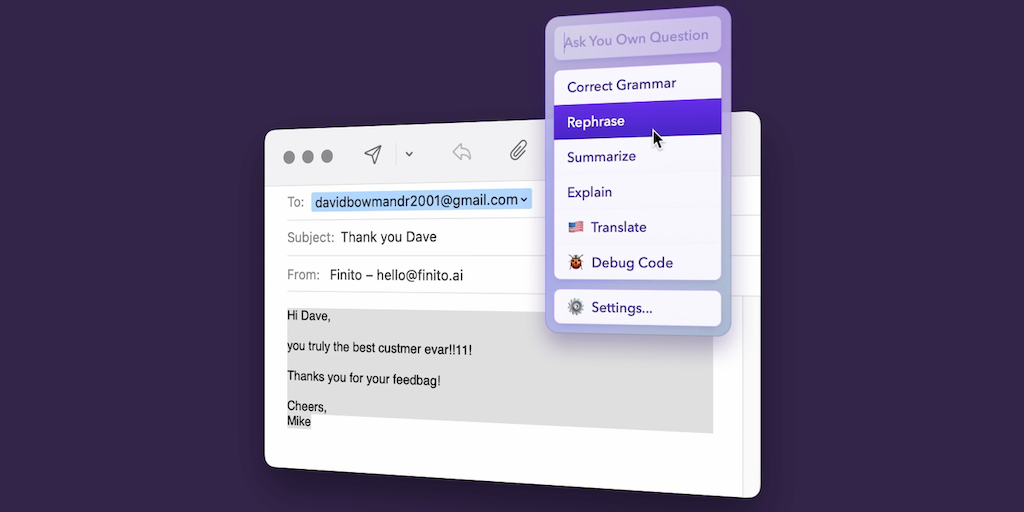 Finito is an AI assistant that works in every app and on every website. It can help you improve your writing 🤩, translate languages 🇫🇷, answer questions❓, generate ideas💡 and more. Just select text in