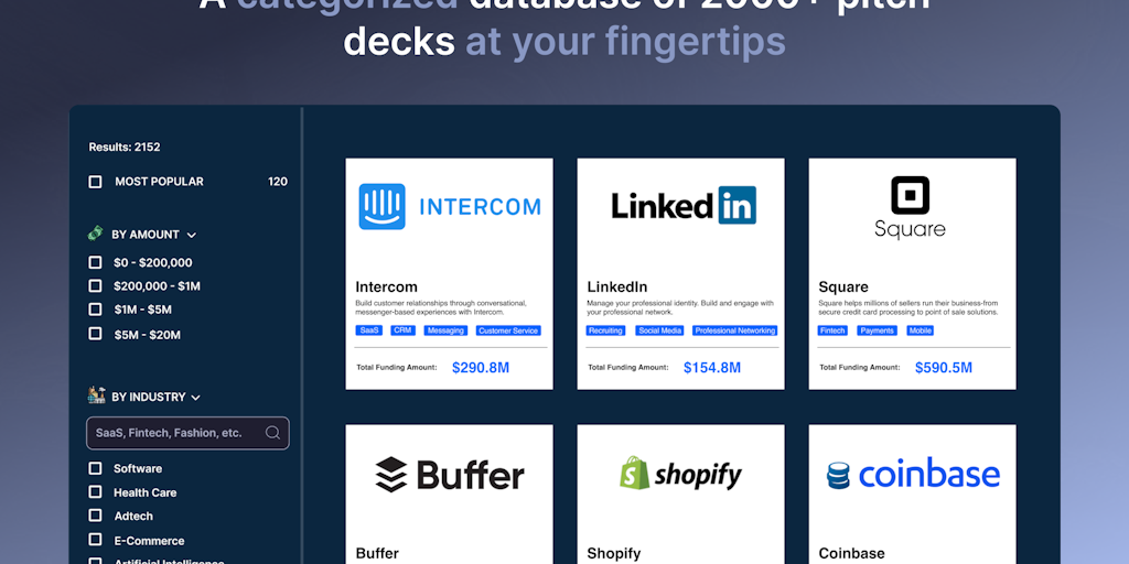 Pitch Deck Database is a categorized collection of 2000+ pitch decks that frees you from the time-consuming process of research on Crunchbase, SlideShare and personal websites trying to find the inves