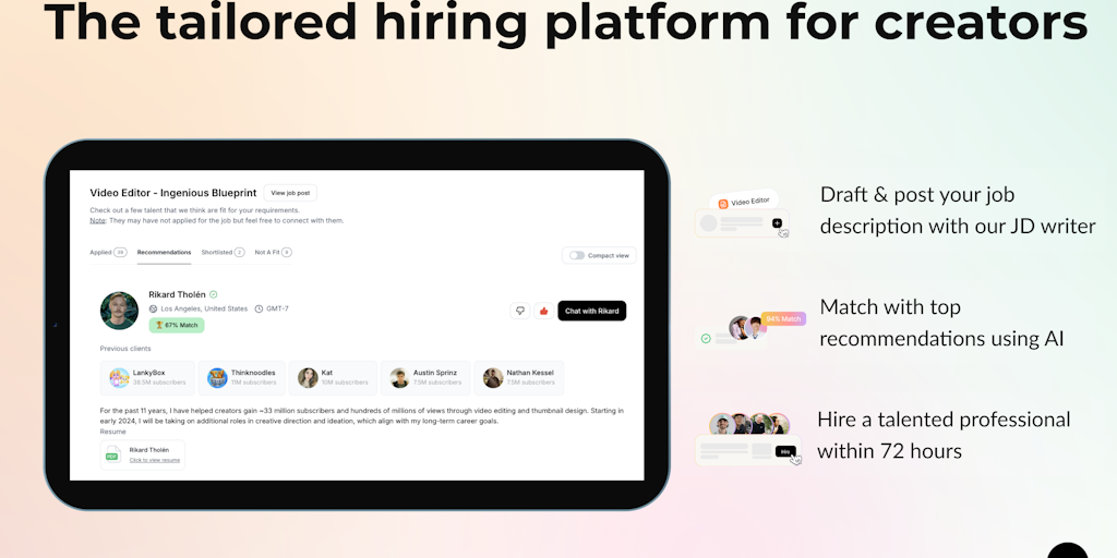 Roster is an AI-powered hiring platform for content creators. It analyzes your content & style to match you with verified talent across 20+ roles. Skip Google Forms and endless portfolios - post a job