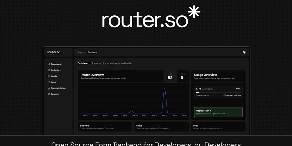 Router.so is am Open Source form handling and lead routing service for developers. It allows you to simply determine schema, generate an endpoint, create a form, and route leads. Sign up for free or o