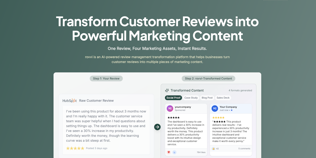 Stop letting customer reviews and testimonials gather dust. rovvi transforms them from 30+ review platforms into blog posts, social content, case studies, and sales deck copy, automatically. Plus, tra