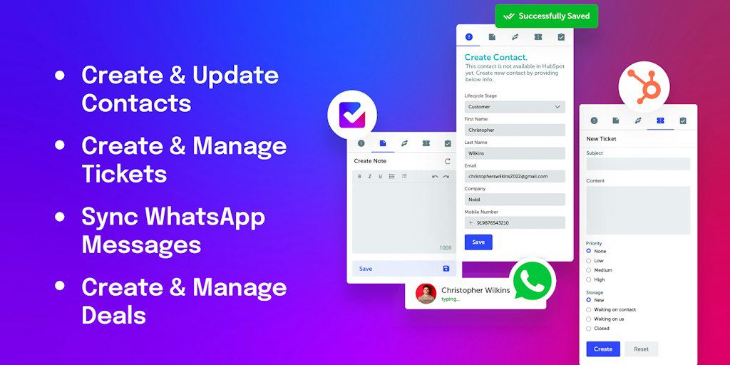 The Chrome Extension, without needing the WhatsApp API, enables quick replies, conversation saving, ticket management, reminders, and scheduling. It integrates HubSpot, Salesforce, and Google Calendar