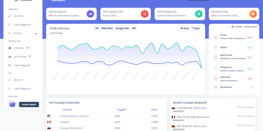 ClickFreeze provides a real-time bot and fake ad clicks protection service that exposes online bots, detects dangerous web traffic, and protects against competition clicks. The solution integrates wit