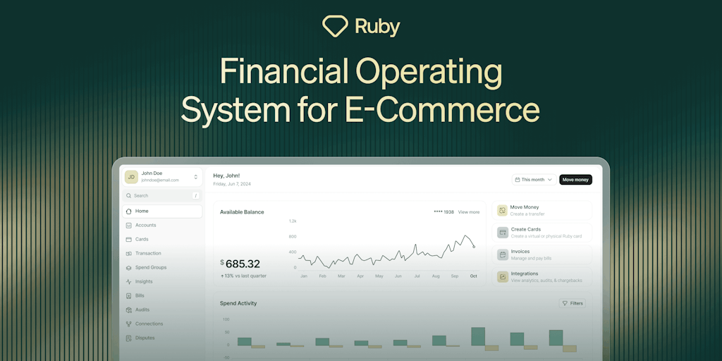 Ruby is an all-in-one financial platform for e-commerce businesses, including banking, corporate cards, accounting, analytics, reimbursements, chargeback protection and more.