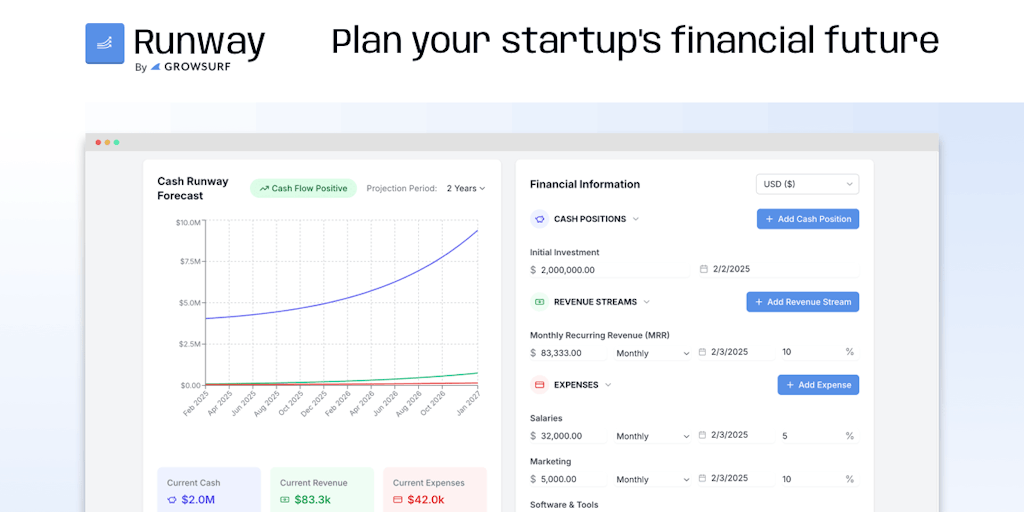 Runway by GrowSurf - Free financial planning & analysis tool for startups | Product Hunt