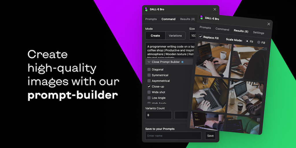 DALL-E Bro is a free plugin for Figma and FigJam makes it super easy to generate text-to-image, create image variations, build your own prompt library, and create stunning visuals using our prompt bui