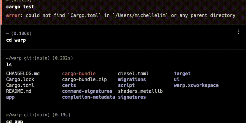 Warp is a modern Rust-based terminal that’s fast, easy to use, and built for teams. 1) Commands and outputs are grouped like a data notebook 2) Input is a modern code-editor with tab completions 3) Sh