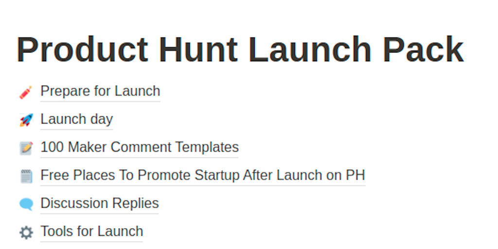 ✓ Preparation and Launch Checklist ✓ 100 Maker Comments Templates ✓ 50 Gratitude Replies ✓ 100 Places to Share Startup After Launch ✓ Product Hunt Communities to share launch ✓ Resouces related to PH