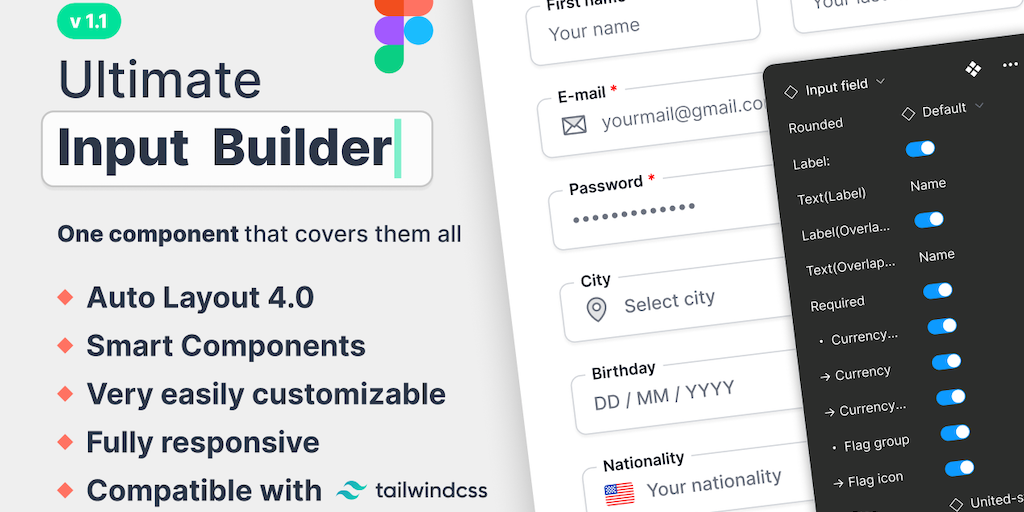 Input builder for Figma. Auto layout 4.0, Smart components, Responsive, Very easily customizable, Compatible with Tailwindcss