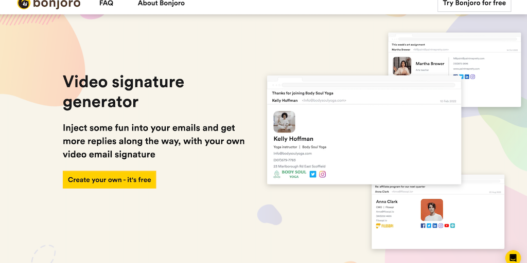 Email signatures are so boring. Let's make yours a bit more fun! Bonjoro's free video signature maker lets you create a fun and friendly GIF signature in less than 5 minutes. Get creative and watch th