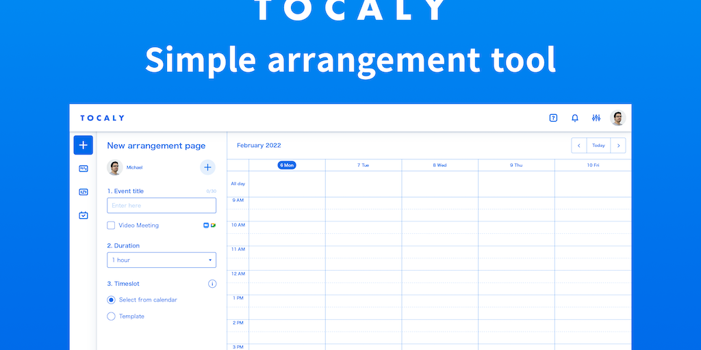Tocaly is a scheduling tool designed with a simple UI for intuitive operation. Free yourself from tiring arrangement planning and minimizing the risk of double booking to increase work productivity!