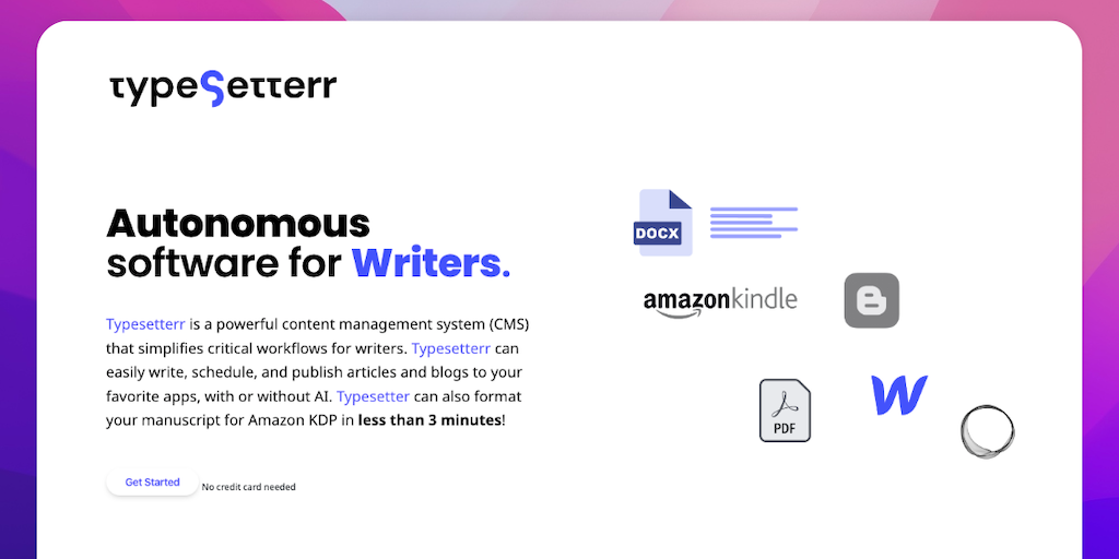 Typesetterr is a powerful CMS that can write, schedule, and publish articles and blogs to your favorite apps, and can even format your book manuscript for Amazon KDP in less than 3 minutes 🤯
