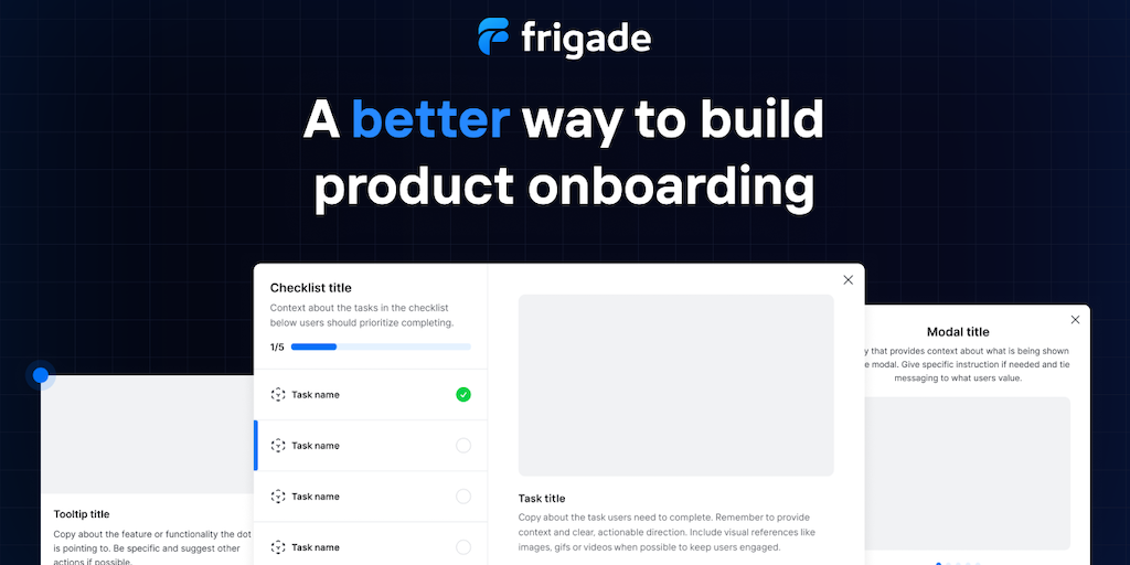 Frigade helps you build best-in-class product onboarding for React apps with beautiful drop-in components and an API. It's combined with a powerful admin dashboard to manage, measure, and iterate on y