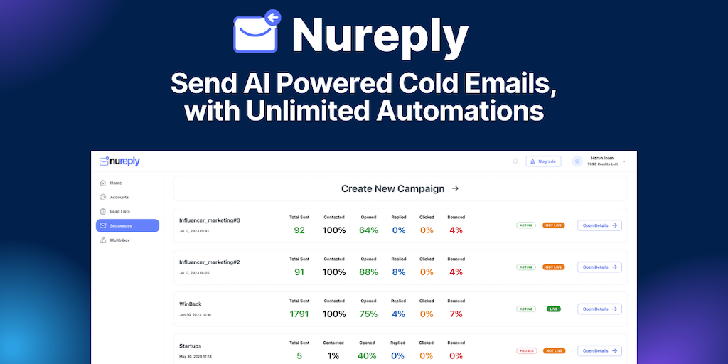 Nureply, AI powered cold outreach platform empowering businesses to create personalized, automated email sequences within minutes. Expand your cold emails with personalization and AI-powered warm up a