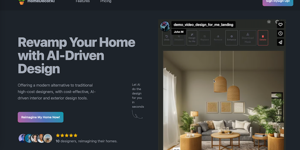 Revamp your home with TheHomeDecorAI: your AI-powered design companion. Explore limitless decor possibilities for interior/exterior spaces, effortlessly remove or replace items in photos, and 2x enhan