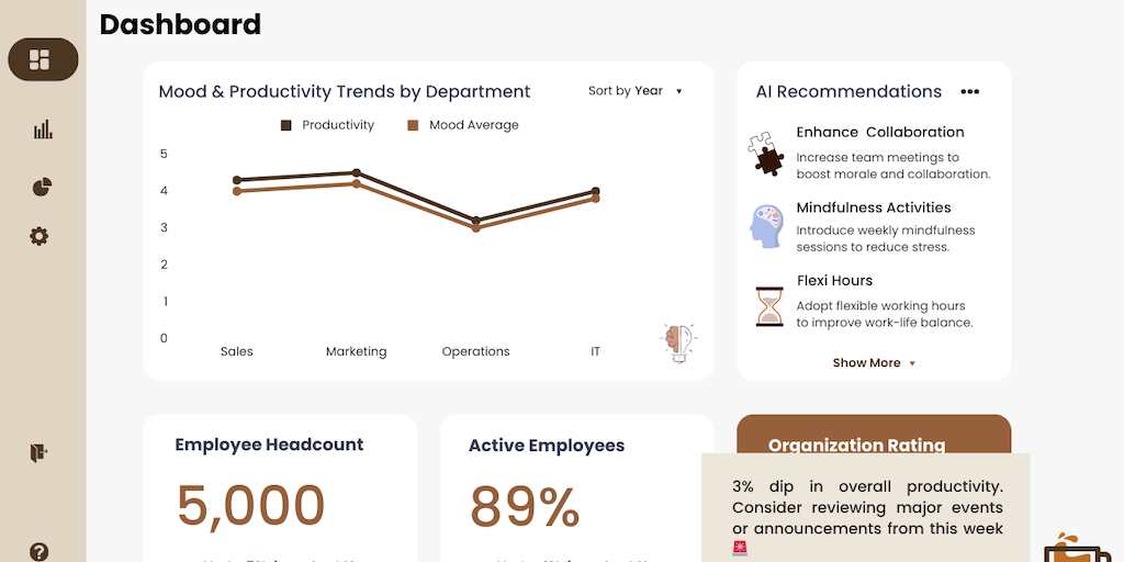 An AI-driven platform focused on boosting organizational well-being. Get real-time insights into employee mental health to guide decision-making and improve your work environment