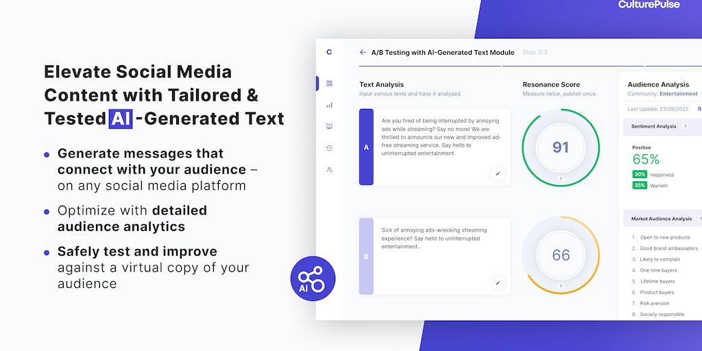 Create, refine, and optimize social media content for any platform without the guesswork. Our newest module generates the content and optimizes it against your audience's psychologically digital twin