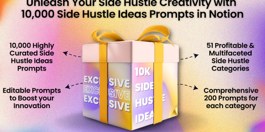 This comprehensive collection of 10,000 Side Hustle Ideas prompts bundle will allow you to tap into your creativity and generate new side hustle ideas without getting stuck.