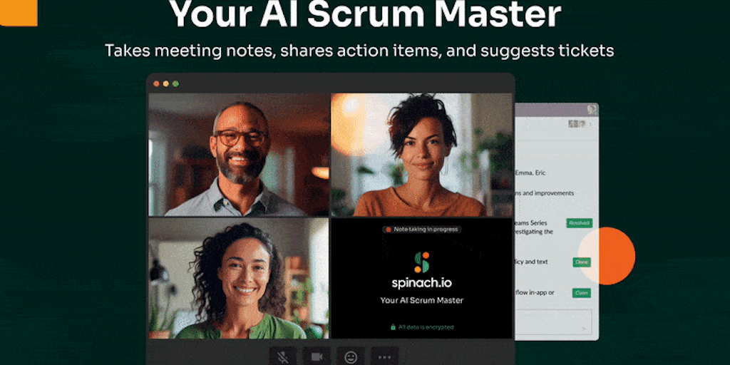 Get an extra teammate who is always on time, takes phenomenal meeting notes, and follows-up with action items and ticket suggestions directly in Slack. That's Spinach, your AI Scrum Master. We're SOC2