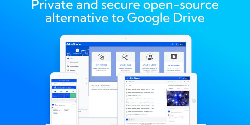 LinShare is the open-source alternative to Google Drive. It is a private and secure file sharing and cloud storage solution that is fully compliant with GDPR. It is made and hosted in the EU.