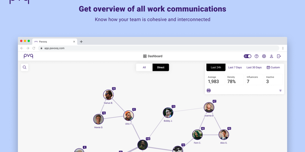 Pavooq is the analytics tool for work communicators, like Slack, MS Teams, Zoom, and work emails. Pavooq connections graph, combined with supporting stats, can help measure team cohesion and reveal the pitfalls and potential risks caused by communication.