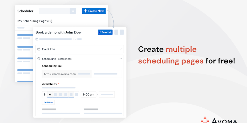 Avoma Scheduler extends the power of Avoma Meeting Lifecycle Assistant by automating bookings, sending reminders to reduce no-shows, and sharing the agenda before the meeting. Create multiple scheduli