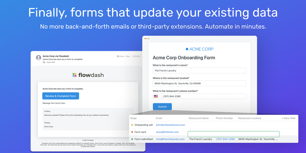 Quickly build engaging, branded forms. Share or embed your forms anywhere to create new records or update existing ones securely and efficiently. Plus, the Flowdash platform includes built-in task man