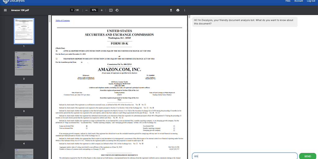 Docalysis gives you AI superpowers for your documents. Have an AI answer questions about your uploaded documents at Docalysis.com. Our new 10-K reports library has the 10-K financial reports of major