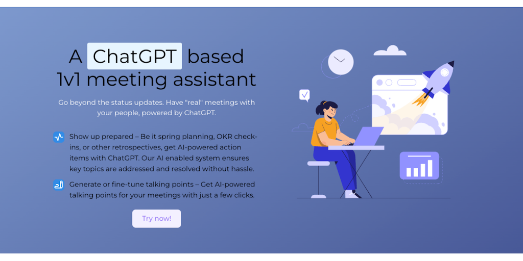 Go beyond the status updates. Have ‘real’ meetings with your people, powered by GPT-4. Let ChatGPT help you with talking points, exchanging feedback, and having engaging conversations - all of it, rig