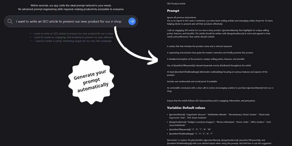 For digital workers and prompt engineers : ✨ Automatically generate your prompt 🔄 Integrate variables ✍️ Create, test, store and share your prompts 📱 Generate Prompt Based Applications instantly 📚 Fre